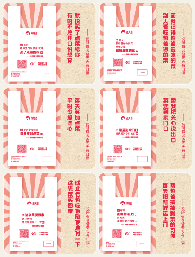 消費者除了物質(zhì)需求,還有情感需求。刺激打動消費者的情感,也能夠驅(qū)動購買。而價值共鳴是提煉賣點最高級的用法,是情感需求的升級版。價值共鳴能夠聚集一批消費者,共同為某個價值點努力。而你的產(chǎn)品借助價值點能夠獲得這群消費者喜愛。例如父親節(jié)期間,淘菜菜推出了百萬個帶有花式文案的創(chuàng)意塑料袋到各地團點。通過這些文案的輸出,用戶買的不再僅僅是菜了,更是一份對家庭、對父親的愛。