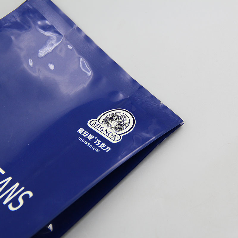 本產(chǎn)品為亮面鍍鋁 四邊封包裝袋 ,鍍鋁層具有一定的遮光作用,阻隔性較強(qiáng),巧克力一般會(huì)使用鋁箔包裝。亮面更能體現(xiàn)鋁箔的光澤感,二者適配性更高。四邊封從包裝材料和生產(chǎn)設(shè)